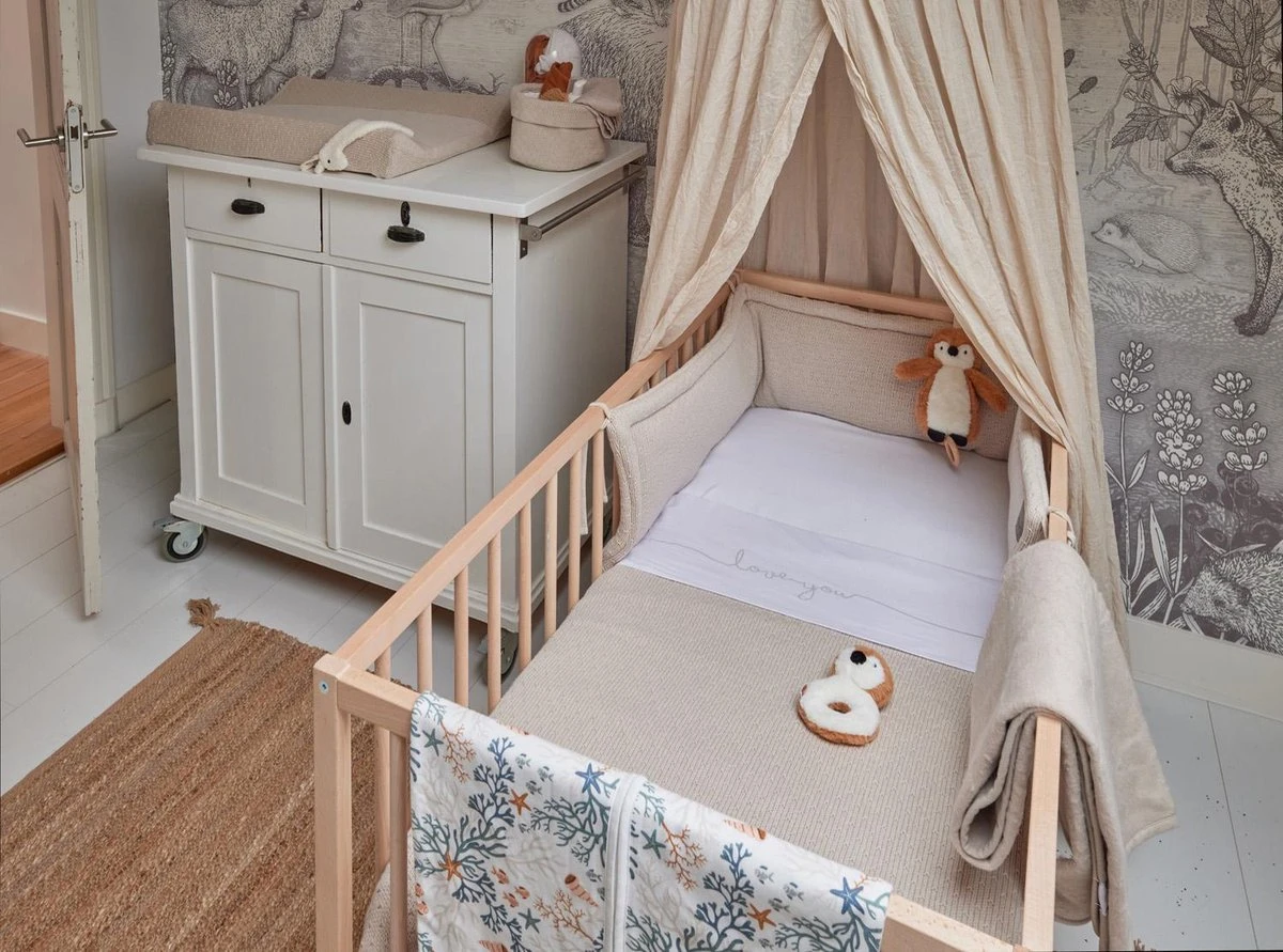 Het laken past met afmeting 120x150cm in een ledikantje. Het is ook in kleiner formaat verkrijgbaar voor wieg en kinderwagen.
