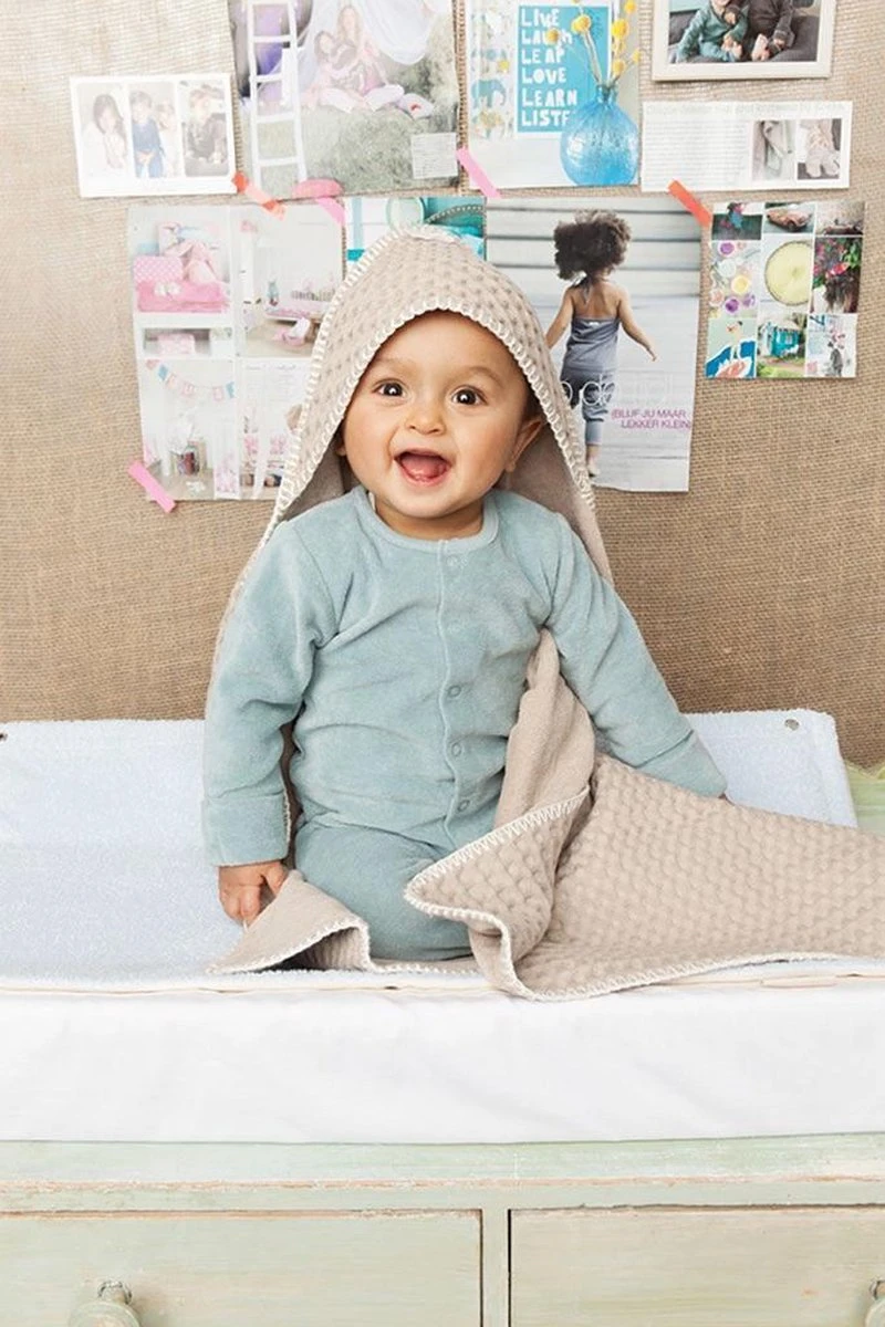 De Koeka omslagdoek met capuchon is met stretch badstof gevoerd en gebruik je om je baby in te wikkelen. Deze omslagdoek is voorzien van een opening zodat de doek ook met de gordels van de auto- of wipstoel gebruikt kan worden. Zo blijft je kleintje altijd comfortabel warm, zowel in huis als onderweg. De omslagdoek is ook fijn om te gebruiken tijdens het voeden en door de badstof voering kan je deze doek ook gebruiken om je kleintje mee afdrogen na het bad. Met de ophanglus hangt de doek altijd binnen handbereik in de bad- of babykamer.